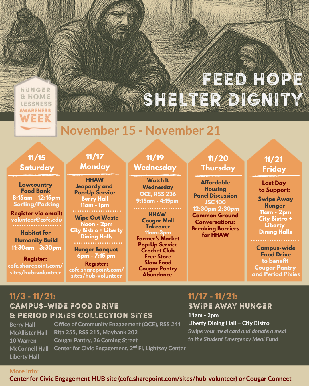Hunger & Homelessness Awareness Week is Nov. 15–21, 2025, and the College of Charleston is coming together to raise awareness and combat housing and food insecurities.