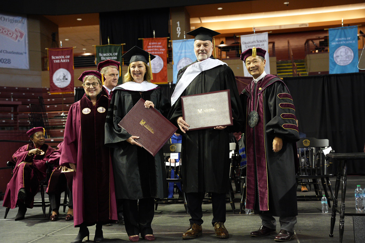 Renee Romberger ’81, chair of the College of Charleston Board of Trustees, presented Tara Hudson Snyder and Lance Alan Snyder with honorary degrees, recognizing that their support, partnership and leadership have enriched the community in meaningful and lasting ways.