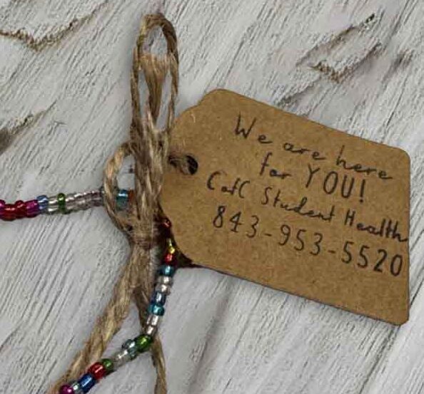 When she noticed students craving something a bit more personal, she took action, securing bead donations and making hundreds of friendship-style bracelets with a special tag sharing the message, “We are here for YOU!” and including phone numbers not only to SHS (843.953.5520), but also to the College’s Counseling Center (843.953.5640) and the national Suicide & Crisis Lifeline (988). Students can pick up the free bracelets at the front desk of Student Health Services.